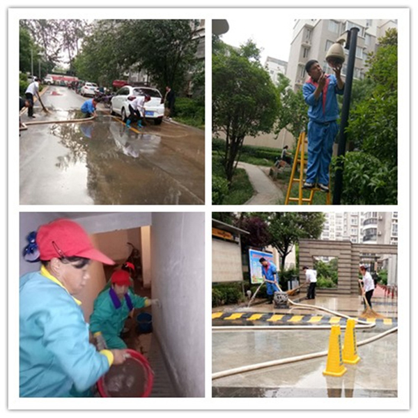 清华物业各项目迅速组织全体员工对小区进行逐项检查,组织员工清理各楼顶、楼道、地下室积水,对主干道进行清淤,对小区绿植进行保护。